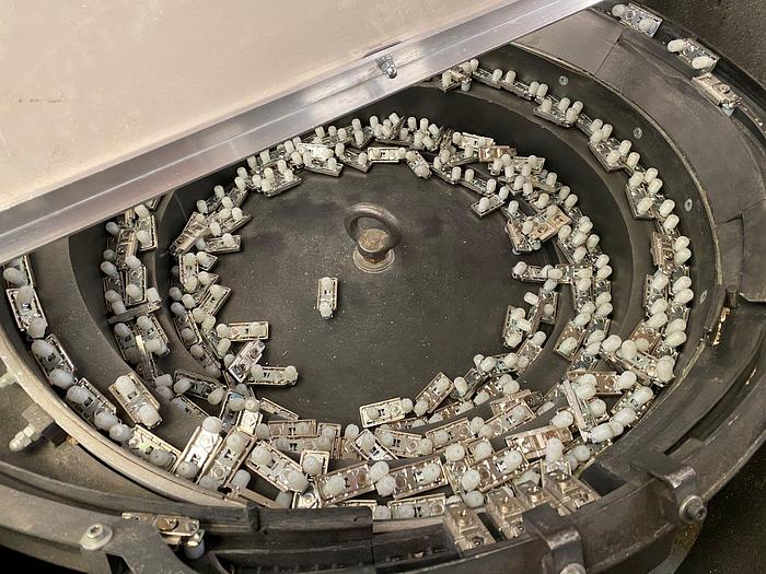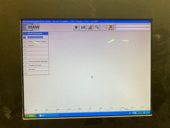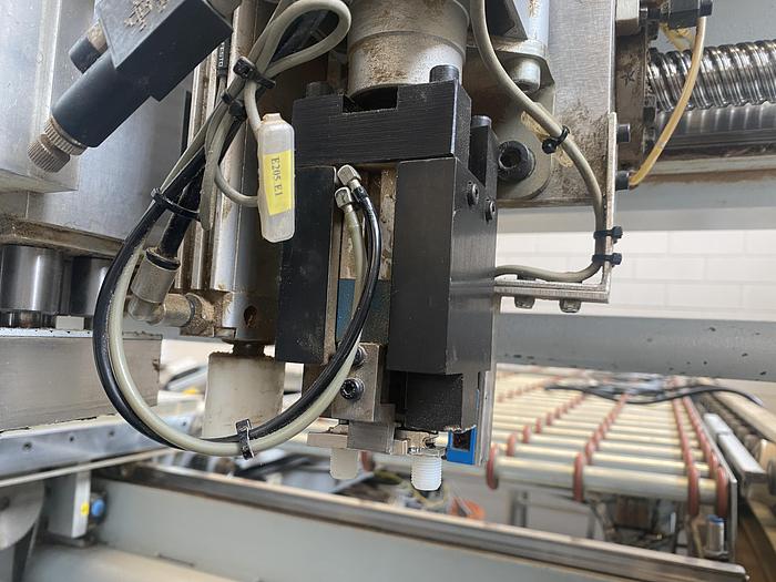 Perceuse traversante électronique automatique pour le traitement des portes de cuisine Commande numérique avec le logiciel WoodWop Dimensions de travail du panneau min max en X mm 267 - 2400 Dimensions de travail du panneau min max en Y mm 120 - 800 Dimensions de travail du panneau min max en Z mm 16 - 32 Système de chargement automatique avec convoyeur à rouleaux motorisé N°2 têtes de perçage supérieures + rainures d'axe Y indépendantes composées comme suit : * tête gauche avec 15 broches verticales en axes X et Y + un bloc lame pour le rainurage * tête droite avec 15 broches verticales en axes X et Y + un bloc d'insertion automatique des charnières 2 têtes de perçage verticales inférieures indépendantes en axe Y avec 5 + 5 broches indépendantes chacune Cuve avec vibreur pour le stockage des charnières et alimentateur automatique Système de déchargement avec convoyeur à rouleaux automatique Grilles de protection périmétriques Dimensions hors tout de la ligne 9,30 x 4,7 m