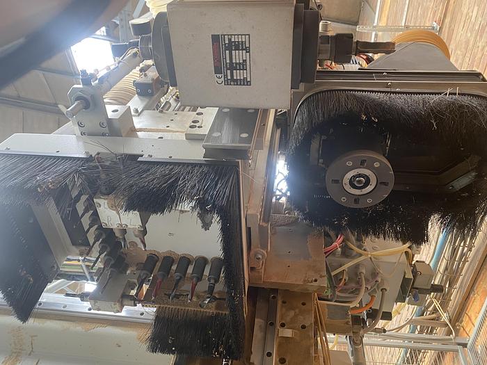 Numerical Control PC MW310 MASTERWORK ver 2.34 R 21.4 Barcode reader Working field in X mm 5100 Working field in Y mm 1300 Work plan with n. 8 manually adjustable bars N ° 3 suction cups for panel support for each bar N ° 1 vertical pantograph with C Vector axis - 8 KW with automatic tool change - HSK cones N ° 1 Horizontal double outlet pantograph 16-position rear tool changer No. of spindles 17 N ° 7 vertical spindles in X axis N ° 6 vertical spindles in Y axis N ° 4 horizontal spindles in X axis N ° 2 horizontal spindles in X axis Blade unit integrated in the fixed boring head in the X axis Front safety mats + perimeter grids Vacuum pump