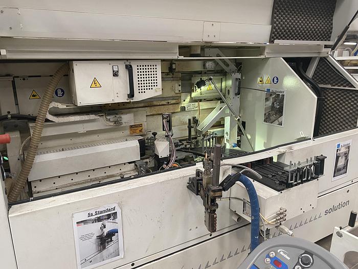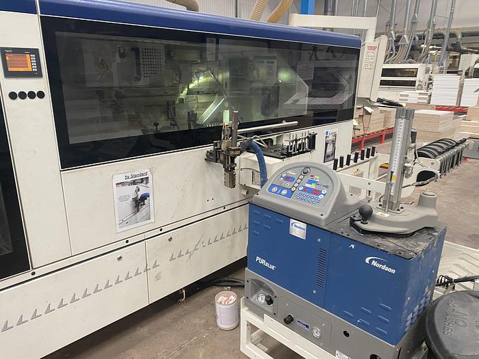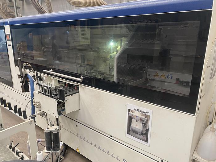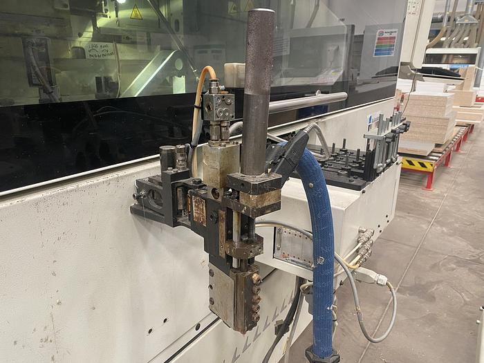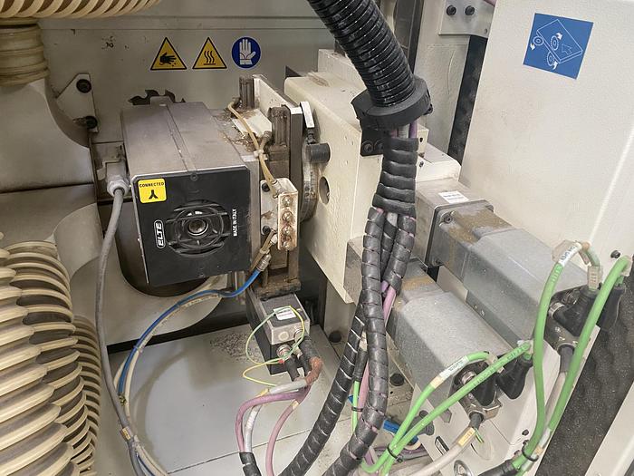 Eye Control - M Panel height 60 mm Pvc / Abs mm 3 Feed speed up to 25 meters / min Working height electronically adjustable by C.N. Motorized rubber belt with higher pressure Panel support guide with electronic regulation by C.N. Side roller conveyor with idle wheels for panel support Anti-adhesive group Rectifier unit with two motors electronically adjustable by C.N. Lamps to heat the edge of the panel Reel holder plate. Gluing unit for PUR glue with pre-melter Edge pressure group on straight profiles with electronically adjustable pressure rollers by C.N. Non-stick group End trimming unit with 2 motors with automatic inclination adjustment Overlapping trimming unit with 2 motors Gluing unit with 2 tilting motors electronically adjustable by C.N. Multi-function rounding unit (gleaner + rounder) electronically adjustable by C.N. Edge scraper unit electronically adjustable by C.N. Tupi group tiltable 0-90 degrees Glue scraper group Brush group Hair dryer group