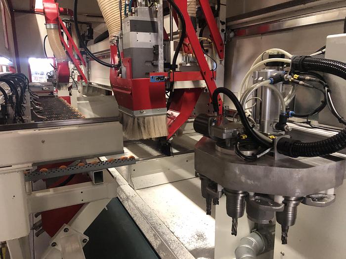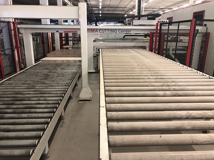 Work center for cutting wooden panels with automatic loading and unloading system Numerical control IMATRONIC NT 231 Ima Cutting Center Importfilter software package Control for label printer - printer type Datamax DMX-I-4208 IMAWOP graphics 17 "monitor Air conditioner on electrical cabinet Automatic NC lubrication Sirio type 560/210 loading magazine panel dimensions 5600x2100 mm sliding speed 100 m / min 5 cycles minute lifting speed from 0 to 25 m / min rear lifting table motorized preload roller conveyors with suction cups loading system X \ Y axis travel speed 85 mt \ min pusher with n. 6 pneumatic grippers panel dimensions min 300 x 600 x 18 mm panel dimensions max mm 2100 x 4200 x 60 panel weight max kg 250 n. 2 pantograph heads KW 11 tool type HSK F 63 with liquid cooling pantographs with n. 2 tool changers with 8 + 8 positions chip evacuation system with motorized belt Wandres panel cleaning system for cutting center type 130/600 with tornado blowing and integrated suction channel panel unloading system from the cutting center by means of a table with automatic suction cups panel dimensions length 240 - 3000 mm \ width 120 - 1400 mm \ thickness 18 - 50 mm translator of all straps