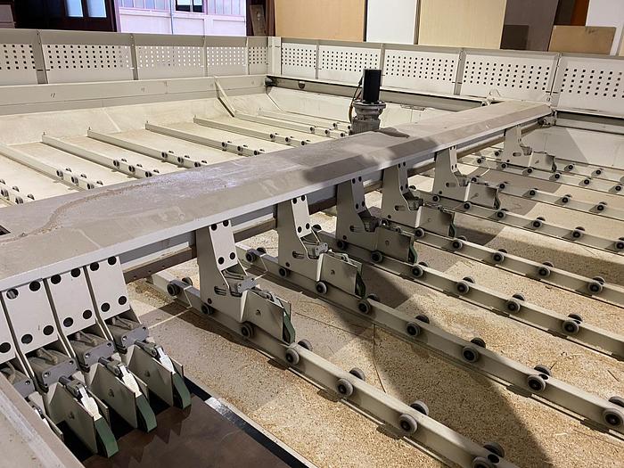 Numerical Control Printer for barcode labels Cutting length 4500 mm Cutting width mm 4300 Blade protrusion mm 115 Front panel loading Lateral aligner with pneumatic rubber cylinder N ° 1 Fixed front Bakelite table with air curtain system and side guide for loading / unloading panels N ° 3 Adjustable front tables in Bakelite with air curtain system for loading / unloading the panels Scoring group (max blade diameter / power) Main blade group (max blade diameter / power) / Kw 7,5 Adjustable speed of the blade carriage (m / min 150 - 170) Pusher carriage with 9 grippers