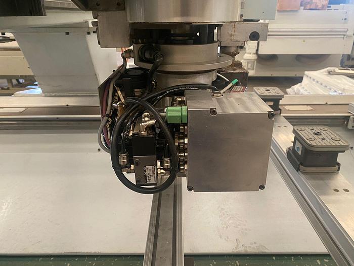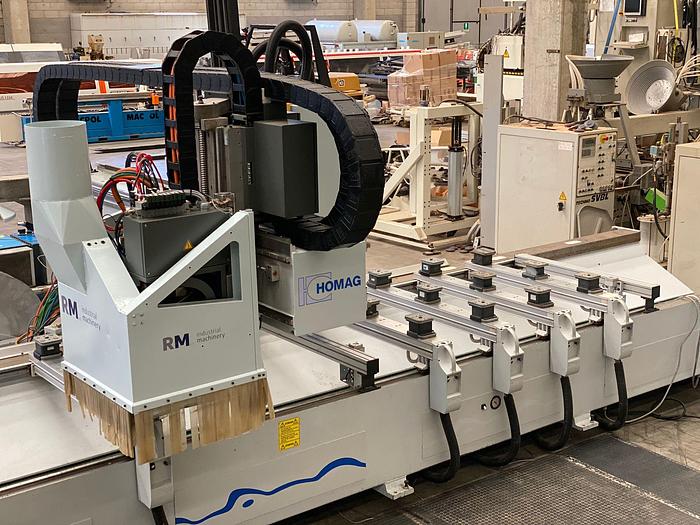 Numerical Control Power Control Homati PC 83 with WoodWop Software Working field in X axis 5800 mm Working field in Y axis 1480 mm N ° 8 adjustable panel support bars for positioning the suction cups N ° 3 adjustable suction cups for each bar with vacuum seal for fixing the panel during processing N ° 1 vertical electrospindle with C axis with automatic tool change, Hsk type cones Automatic tool change with 18 positions on the back of the machine Boring head with 18 spindles arranged as follows: - N ° verticals in X axis 11 - No. of verticals in Y axis 7 - N ° 1 cross aggregate Edging unit with glue pot and pre-melting device for EVA glue N ° 1 blade aggregate N ° 1 trimming aggregate N ° 1 edge scraper aggregate Edge holder magazine Front protection and safety system with carpets Chip evacuation system with motorized belt Air conditioning system for cooling and cleaning the machine control N ° 1 vacuum pump
