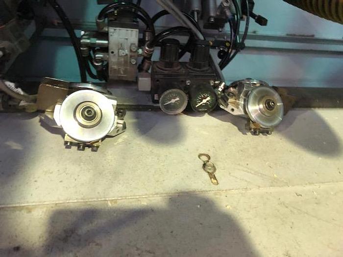 Power Control Pc 22 Panel height 60 mm Solid wood mm 20 Pvc / Abs mm 3 Feed speed up to mt / min 24 Working height electronically adjustable by C.N. Motorized rubber belt with higher pressure Panel support guide Side roller conveyor with idle wheels for panel support Rectifier group with two motors Lamps to heat the edge of the panel 2-position reel holder magazine with automatic edge change from C.N. Gluing unit for EVA hot melt glue with pre-melter and glue pot Edge pressure group on straight profiles with electronically adjustable pressure rollers by C.N. End trimming unit with 2 motors with automatic inclination adjustment Overlapping trimming unit with 2 motors Rounding unit FK 11 with 2 multifunction motors (gleaner + rounder) with control adjustment numeric automatically Edge scraper group Glue scraper group Brush group