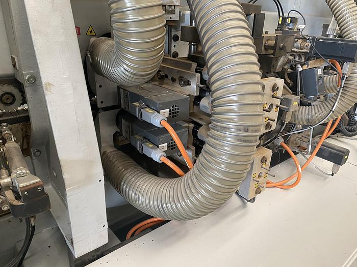 Power Control Pc 20+ Panel height 60 mm Solid mm 12 Pvc / Abs mm 3 Feed speed up to mt / min 11 (opt 14) Working height electronically adjustable by C.N. Panel support guide Side roller conveyor with idle wheels for panel support Rectifier group with 2 motors Reel holder plate Gluing unit for EVA hot melt glue with glue pot Edge pressure group on straight profiles with pressure rollers electronically adjustable by NC End trimming unit with automatic inclination adjustment Overlapping trimming unit with 2 motors Offset edging unit with 2 motors with electronic control from NC Rounding unit with 2 motors with automatic adjustment by numerical control Edge scraper group Glue scraper group Brush group